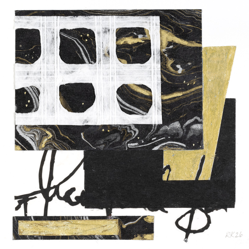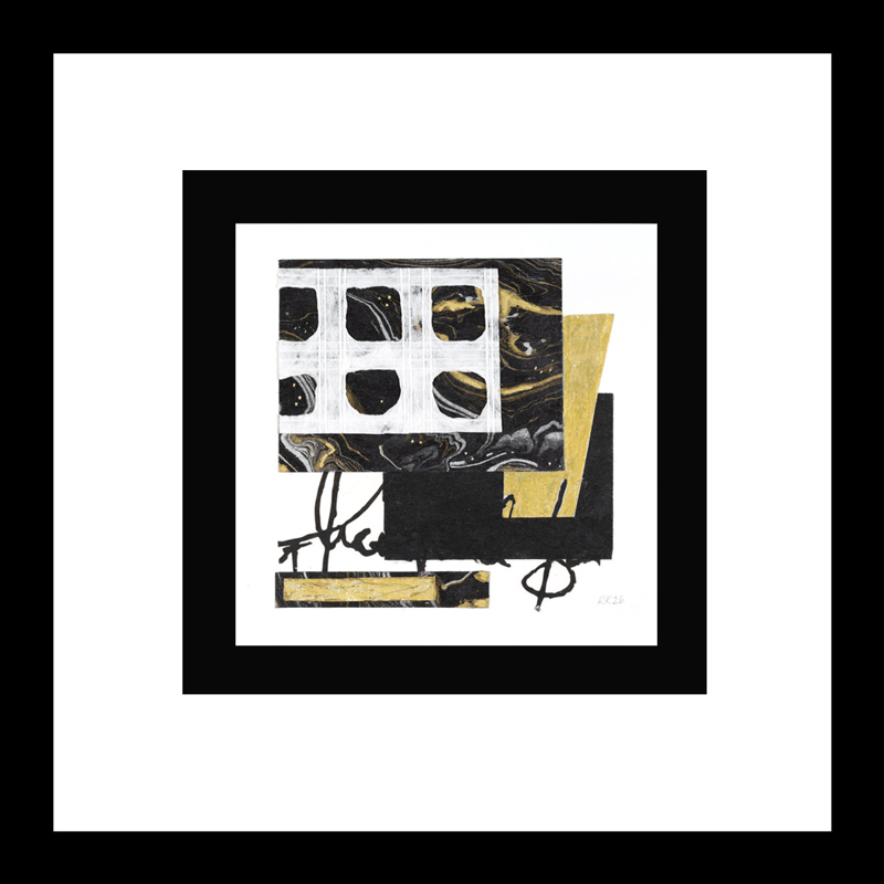 Mixed media collage on paper Artwork size: 6″ x 6″ Matted with black wood 12″x 12″ frame